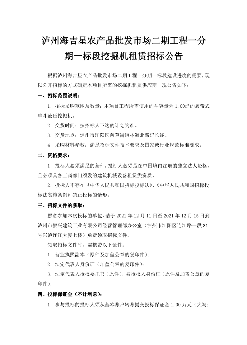 瀘州海吉星農(nóng)產(chǎn)品批發(fā)市場二期工程一分期一標段挖掘機租賃招標公告