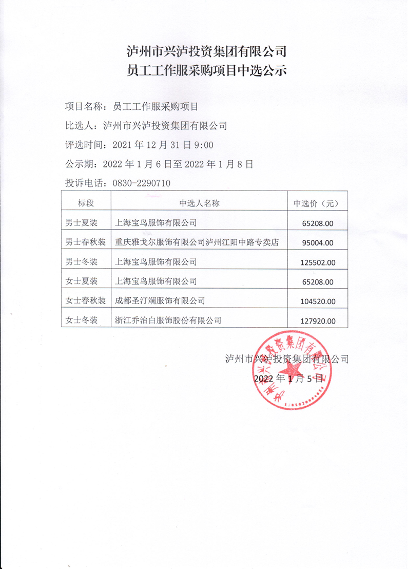 瀘州市興瀘投資集團有限公司員工工作服采購項目中選公示
