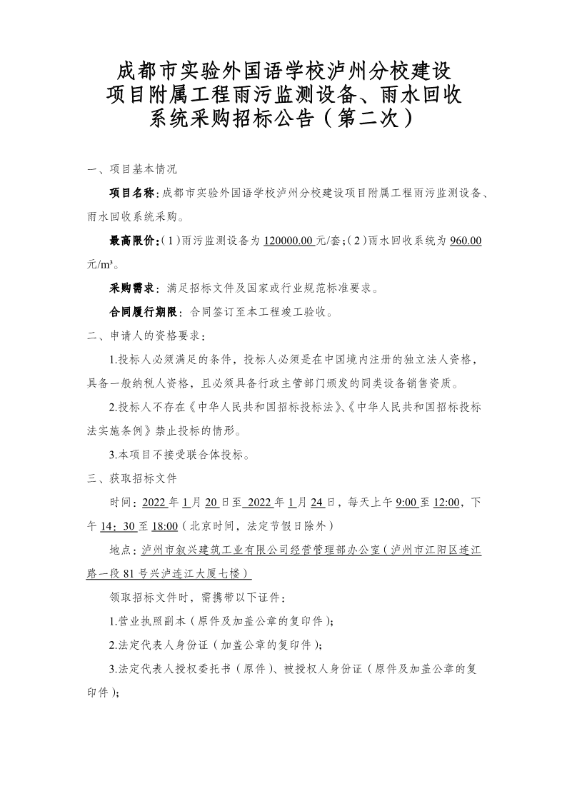 成都市實驗外國語學校瀘州分校建設(shè)項目附屬工程雨污監(jiān)測設(shè)備、雨水回收系統(tǒng)采購招標公告(第二次) 作者: 來源: 日期:2022-01-19 瀏覽次數(shù): 次 【字體:小 大】 【打印正文】