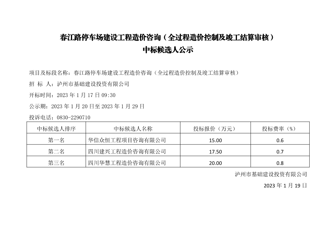春江路停車場(chǎng)建設(shè)工程造價(jià)咨詢(全過程造價(jià)控制及竣工結(jié)算審核)中標(biāo)候選人公示 作者: 來源: 日期:2023-01-19 瀏覽次數(shù): 次 【字體:小 大】 【打印正文】