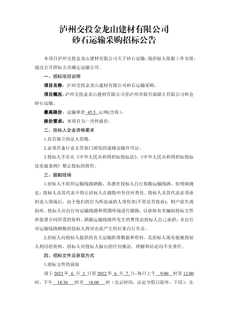 瀘州交投金龍山建材有限公司 砂石運輸采購招標公告
