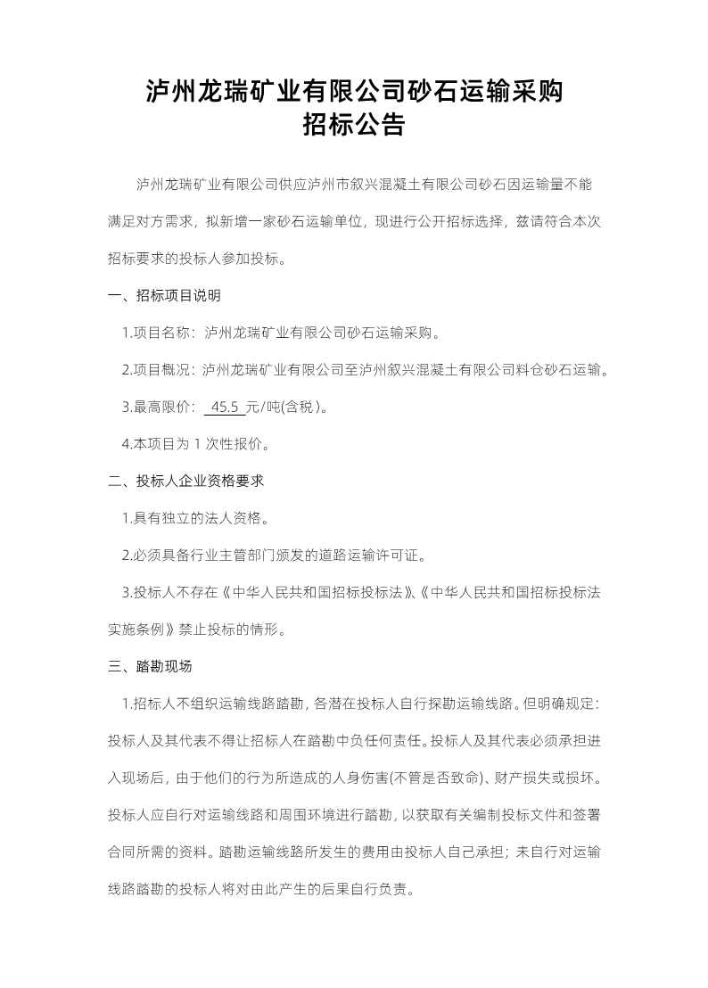 瀘州龍瑞礦業(yè)有限公司砂石運輸采購招標公告