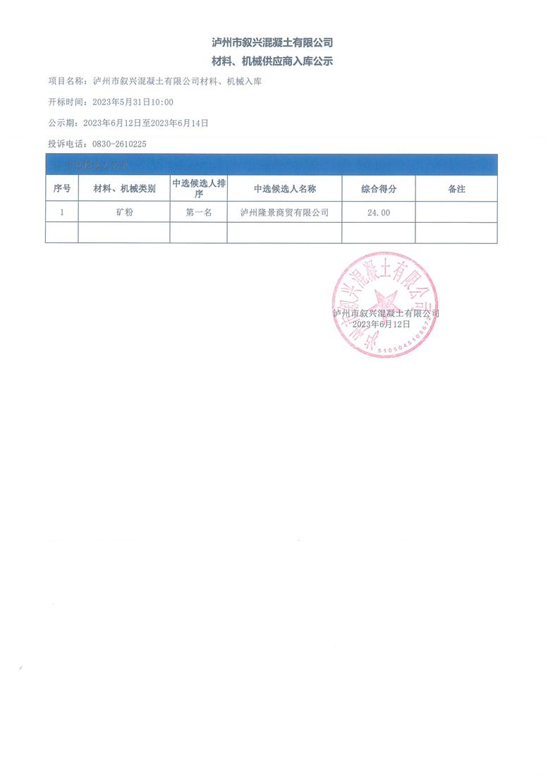 瀘州市敘興混凝土有限公司材料、機(jī)械供應(yīng)商入庫公示