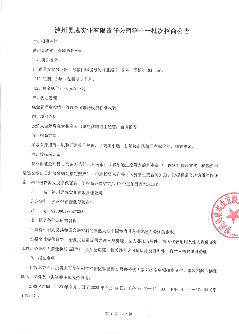 瀘州昊成實(shí)業(yè)有限責(zé)任公司第十一批次招商公告