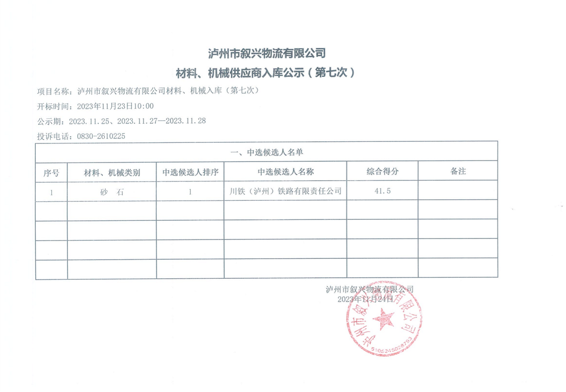 瀘州市敘興物流有限公司材料、機(jī)械供應(yīng)商入庫公示(第七次)