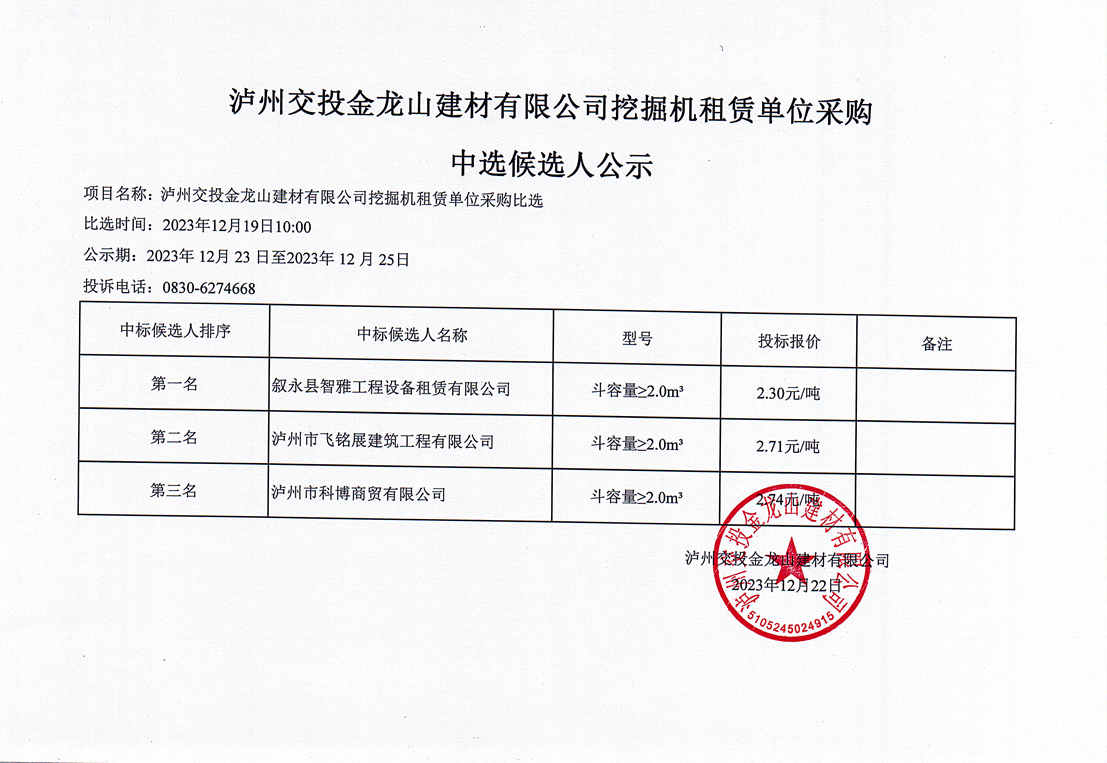 瀘州交投金龍山建材有限公司挖掘機(jī)租賃單位采購中選候選人公示