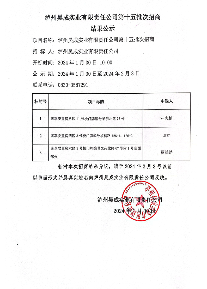 瀘州昊成實(shí)業(yè)有限責(zé)任公司第十五批次招商結(jié)果公示