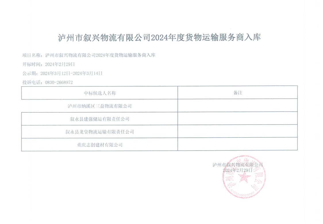 瀘州市敘興物流有限公司2024年度貨物運輸服務商入庫中標候選人名稱