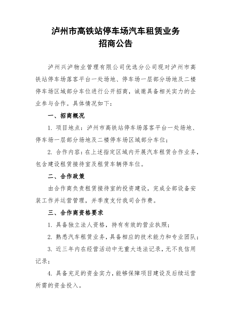 瀘州市高鐵站停車場汽車租賃業(yè)務(wù)招商公告