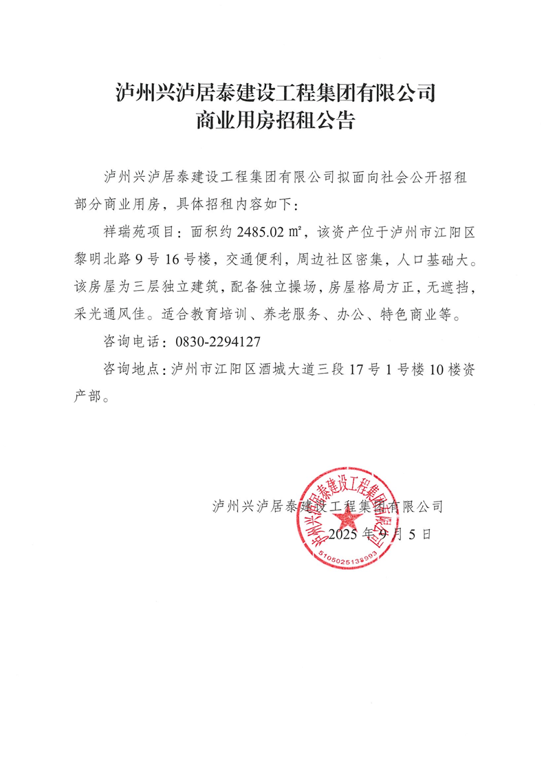 瀘州興瀘居泰建設(shè)工程集團(tuán)有限公司商業(yè)用房招租公告