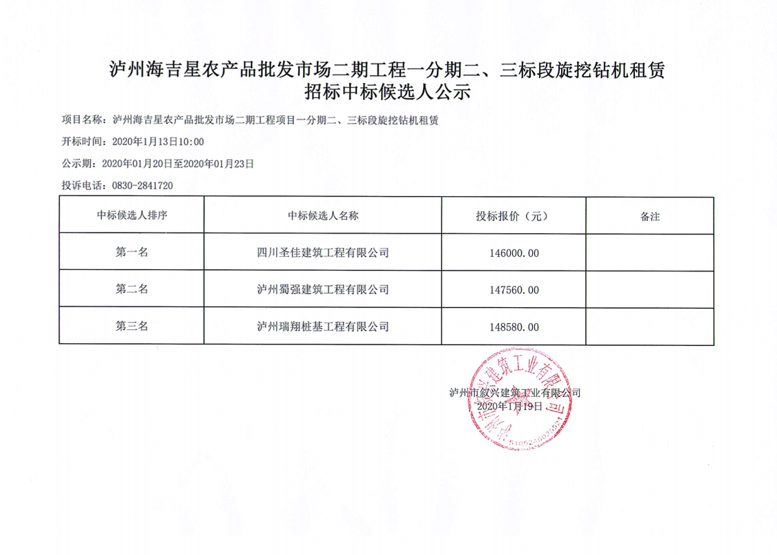 瀘州海吉星農(nóng)產(chǎn)品市場二期項(xiàng)目一分期二、三標(biāo)段旋挖鉆機(jī)租賃招標(biāo)中標(biāo)候選人公示 作者: 來源: 日期:2020-01-19 瀏覽次數(shù): 次 【字體:小 大】 【打印正文】