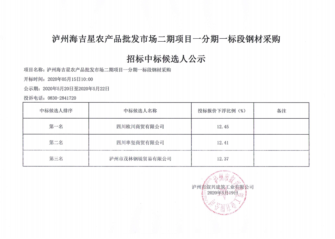瀘州海吉星農(nóng)產(chǎn)品批發(fā)市場(chǎng)二期項(xiàng)目一分期一標(biāo)段鋼材采購招標(biāo)中標(biāo)候選人公示 作者: 來源: 日期:2020-05-19 瀏覽次數(shù): 次 【字體:小 大】 【打印正文】