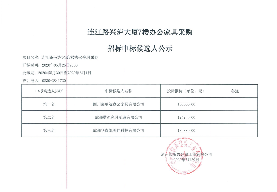 連江路興瀘大廈7樓辦公家具采購招標(biāo)中標(biāo)候選人公示
