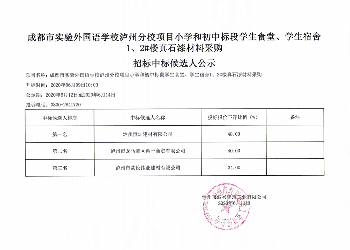 成都市實驗外國語學(xué)校瀘州分校項目小學(xué)和初中標(biāo)段學(xué)生食堂、學(xué)生宿舍1、2#樓真石漆材料采購中標(biāo)候選人公示 作者: 來源: 日期:2020-06-11 瀏覽次數(shù): 次 【字體:小 大】 【打印正文】
