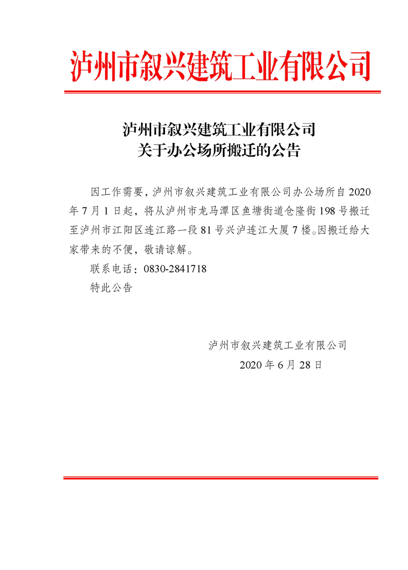 瀘州市敘興建筑工業(yè)有限公司關(guān)于辦公場(chǎng)所搬遷的公告