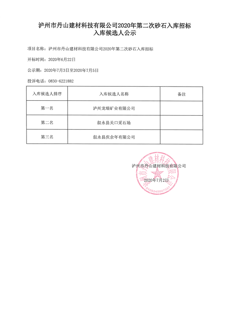 瀘州市丹山建材科技有限公司2020年第二次砂石入庫招標(biāo)-入庫候選人公示