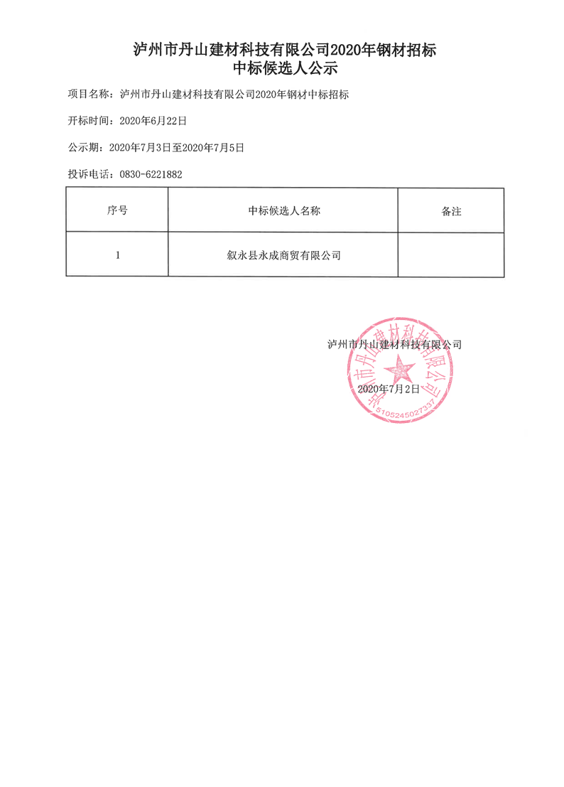 瀘州市丹山建材科技有限公司2020年鋼材招標-中標候選人公示