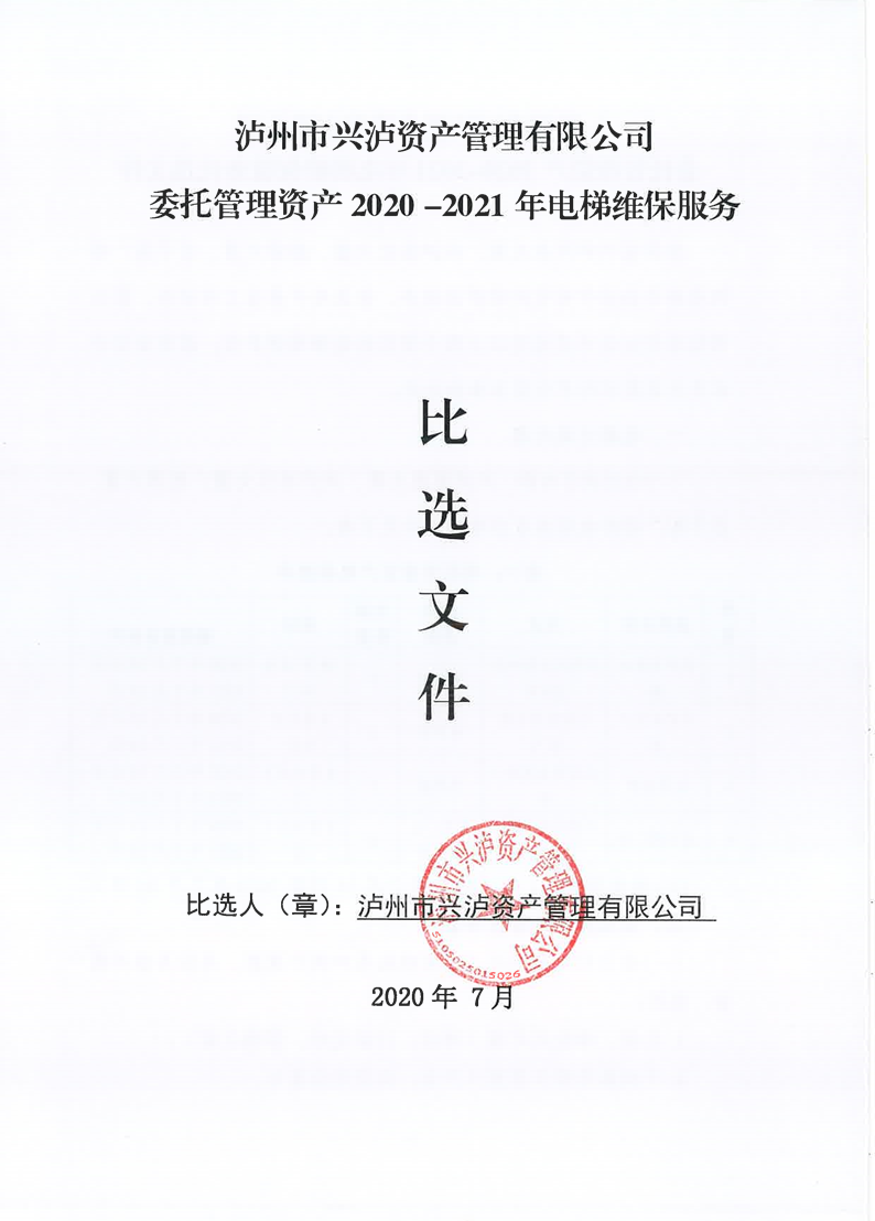 瀘州市興瀘資產(chǎn)管理有限公司委托管理資產(chǎn)2020-2021年電梯維保服務(wù)比選文件 作者: 來(lái)源: 日期:2020-07-17 瀏覽次數(shù): 次 【字體:小 大】 【打印正文】