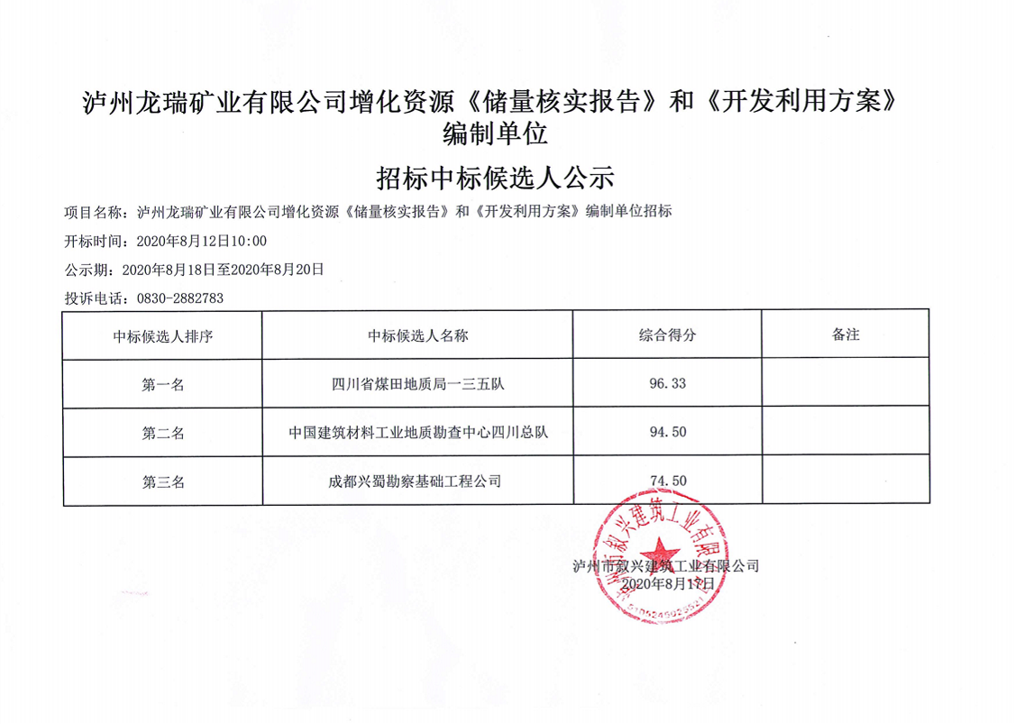 瀘州龍瑞礦業(yè)有限公司增化資源《儲量核實報告》和《開發(fā)利用方案》編制單位招標中標候選人公示 作者: 來源: 日期:2020-08-17 瀏覽次數(shù): 次 【字體:小 大】 【打印正文】