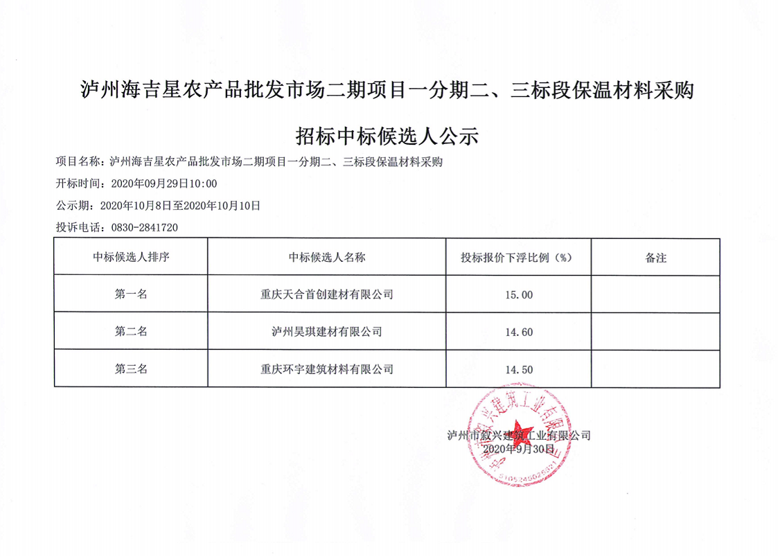 瀘州海吉星農(nóng)產(chǎn)品批發(fā)市場二期項目一分期二三標段保溫材料采購招標中標候選人公示 作者: 來源: 日期:2020-09-30 瀏覽次數(shù): 次 【字體:小 大】 【打印正文】