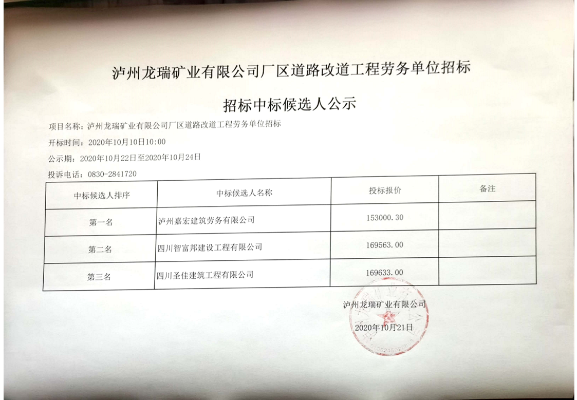 瀘州龍瑞礦業(yè)有限公司廠區(qū)道路改道工程勞務(wù)單位招標(biāo)中標(biāo)候選人公示 作者: 來源: 日期:2020-10-21 瀏覽次數(shù): 次 【字體:小 大】 【打印正文】