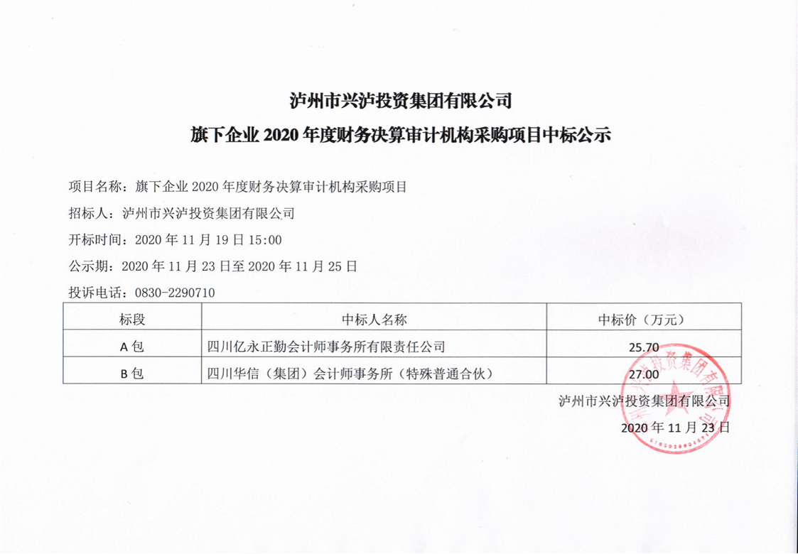 瀘州市興瀘投資集團(tuán)有限公司旗下企業(yè)2020年度財(cái)務(wù)決算審計(jì)機(jī)構(gòu)采購項(xiàng)目中標(biāo)公示 作者: 來源: 日期:2020-11-23 瀏覽次數(shù): 次 【字體:小 大】 【打印正文】