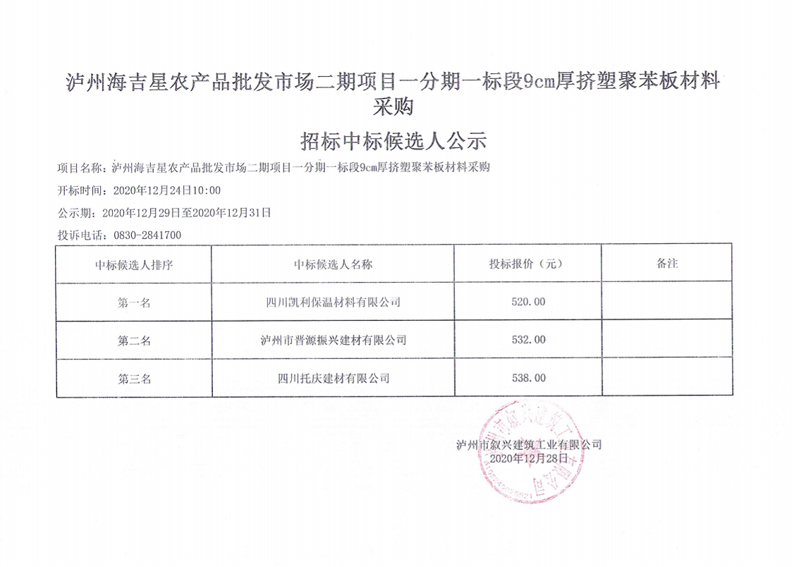 瀘州海吉星農產品批發(fā)市場二期項目一分期一標段9cm厚擠塑聚苯板材料采購招標中標候選人公示