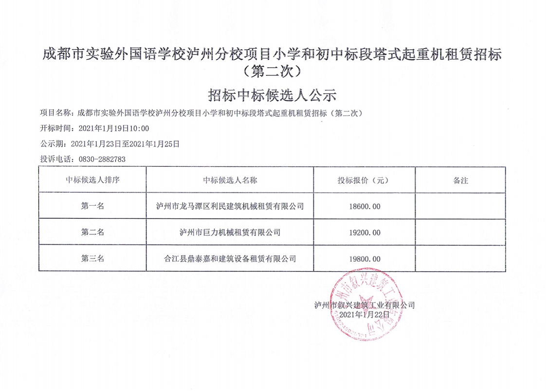 成都市實(shí)驗(yàn)外國(guó)語(yǔ)學(xué)校瀘州分校項(xiàng)目小學(xué)和初中標(biāo)段塔式起重機(jī)租賃招標(biāo)(第二次)中標(biāo)候選人公示 作者: 來(lái)源: 日期:2021-01-22 瀏覽次數(shù): 次 【字體:小 大】 【打印正文】