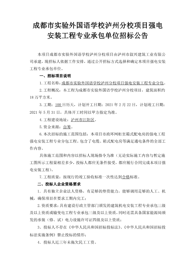 成都市實(shí)驗(yàn)外國(guó)語(yǔ)學(xué)校瀘州分校項(xiàng)目強(qiáng)電安裝工程專(zhuān)業(yè)承包單位招標(biāo)公告 作者: 來(lái)源:54 日期:2021-02-05 瀏覽次數(shù): 次 【字體:小 大】 【打印正文】