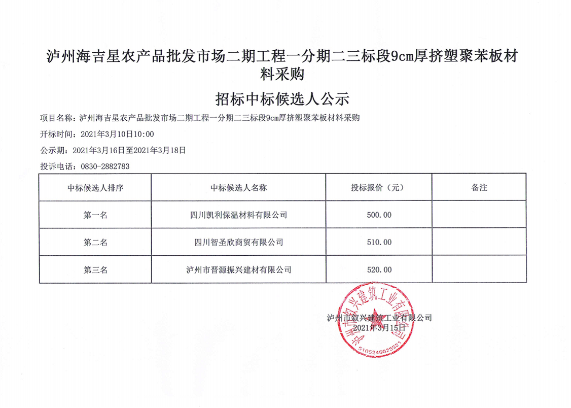 瀘州海吉星農(nóng)產(chǎn)品批發(fā)市場二期工程一分期二三標段9cm厚擠塑聚苯板材料采購招標中標候選人公示 作者: 來源: 日期:2021-03-15 瀏覽次數(shù): 次 【字體:小 大】 【打印正文】