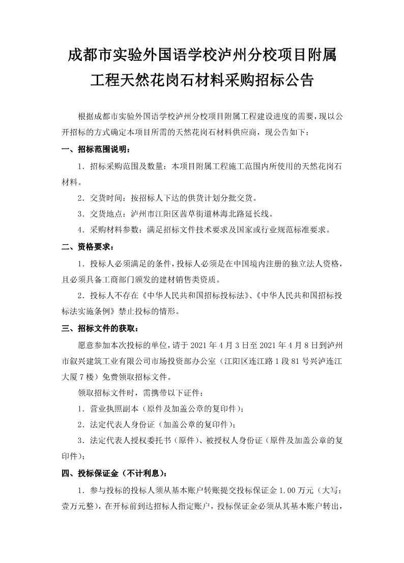 成都市實(shí)驗(yàn)外國語學(xué)校瀘州分校項(xiàng)目附屬工程天然花崗石材料采購招標(biāo)公告 作者: 來源: 日期:2021-04-02 瀏覽次數(shù): 次 【字體:小 大】 【打印正文】