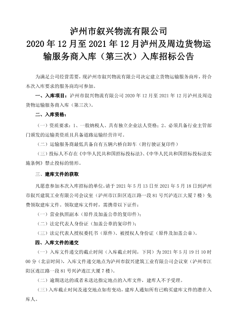 瀘州市敘興物流有限公司2020年12月至2021年12月瀘州及周邊貨物運(yùn)輸服務(wù)商入庫(kù)(第三次)入庫(kù)招標(biāo)公告 作者: 來(lái)源: 日期:2021-05-12 瀏覽次數(shù): 次 【字體:小 大】 【打印正文】