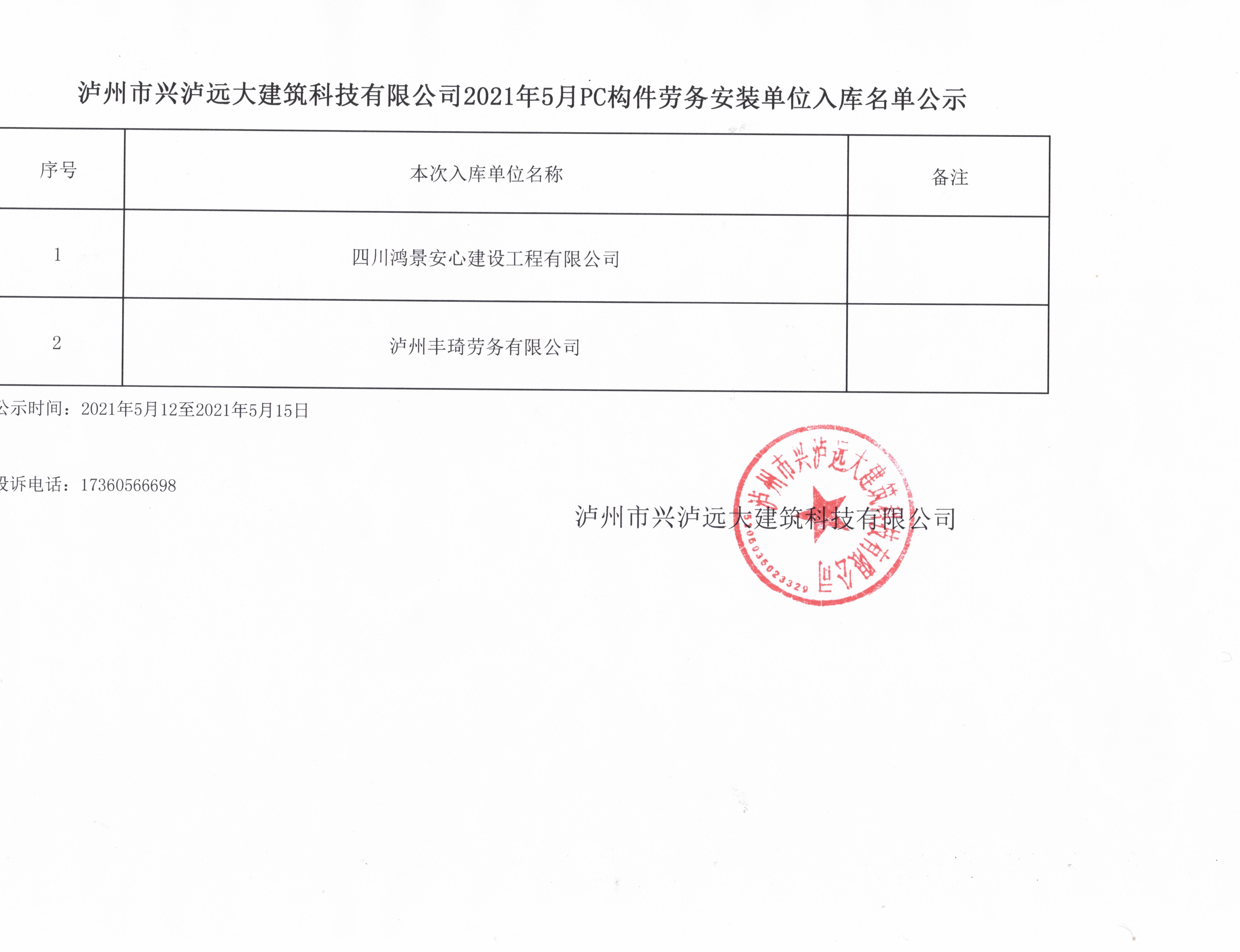 瀘州市興瀘遠(yuǎn)大建筑科技有限公司2021年5月PC構(gòu)件勞務(wù)安裝單位入庫(kù)名單公示.jpg