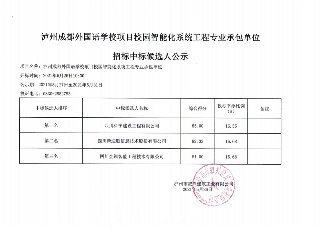 瀘州成都外國(guó)語(yǔ)學(xué)校項(xiàng)目校園智能化系統(tǒng)工程專業(yè)承包單位招標(biāo)中標(biāo)候選人公示 作者: 來(lái)源: 日期:2021-05-26 瀏覽次數(shù): 次 【字體:小 大】 【打印正文】