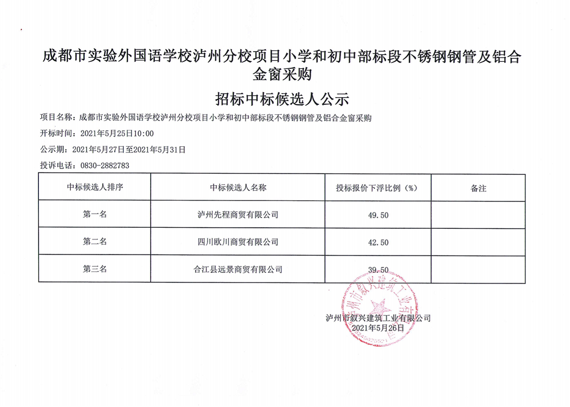 成都市實驗外國語學(xué)校瀘州分校建設(shè)項目小學(xué)和初中標段不銹鋼管及鋁合金窗采購招標中標候選人公示 作者: 來源: 日期:2021-05-26 瀏覽次數(shù): 次 【字體:小 大】 【打印正文】