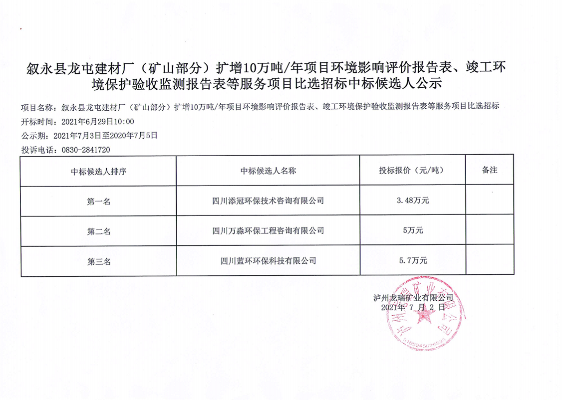 敘永縣龍屯建材廠(礦山部分)擴(kuò)增10萬每年項(xiàng)目環(huán)境影響評(píng)價(jià)報(bào)告、竣工環(huán)境保護(hù)驗(yàn)收監(jiān)測報(bào)告表等服務(wù)項(xiàng)目招標(biāo)中標(biāo)候選人公示