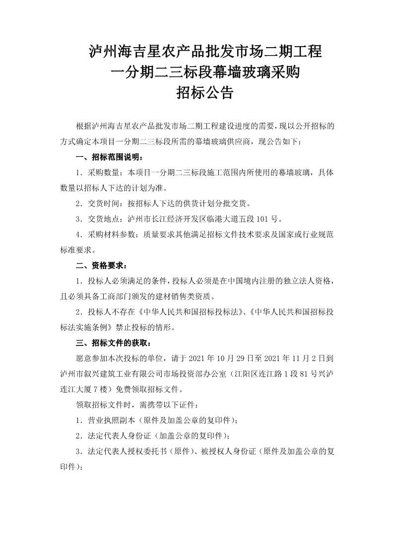 瀘州海吉星農(nóng)產(chǎn)品批發(fā)市場二期工程一分期二三標段幕墻玻璃采購招標公告
