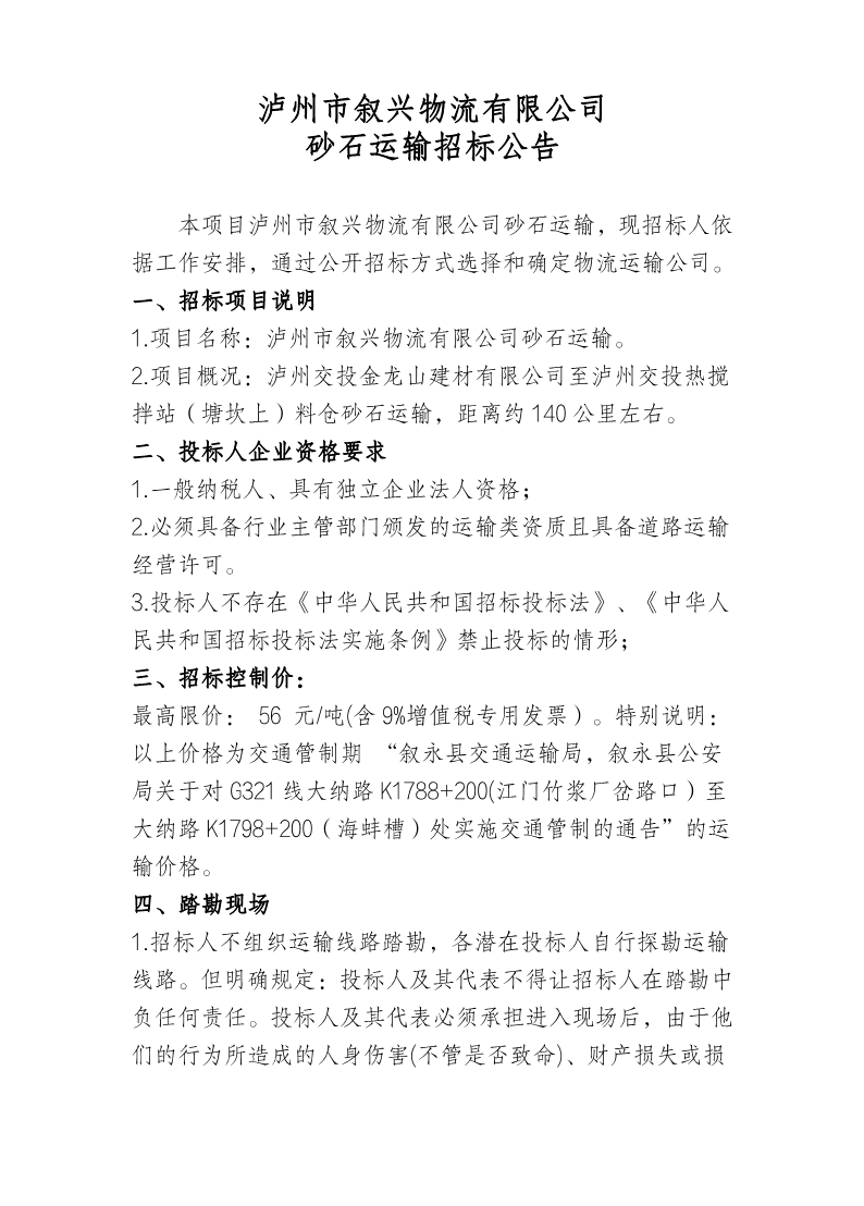 瀘州市敘興物流有限公司砂石運(yùn)輸招標(biāo)公告