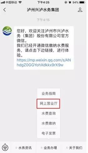 用戶可通過關(guān)注“瀘州興瀘水務(wù)集團(tuán)”公眾微信號,選擇業(yè)務(wù)辦理-網(wǎng)上營業(yè)廳或登錄“瀘州市政務(wù)服務(wù)和非公經(jīng)濟(jì)發(fā)展局網(wǎng)站網(wǎng)上大廳”辦理用水相關(guān)業(yè)務(wù),真正體驗用水業(yè)務(wù)從“腿上辦”到"掌上辦"的轉(zhuǎn)變。