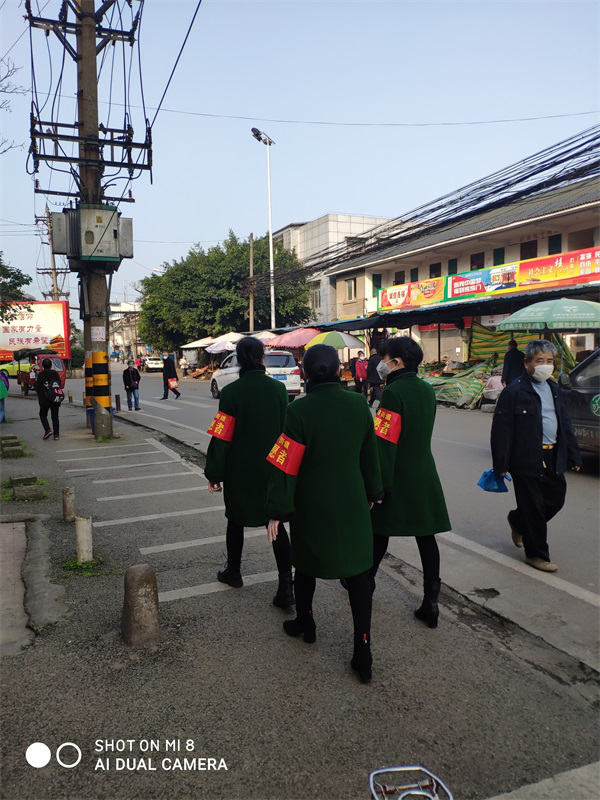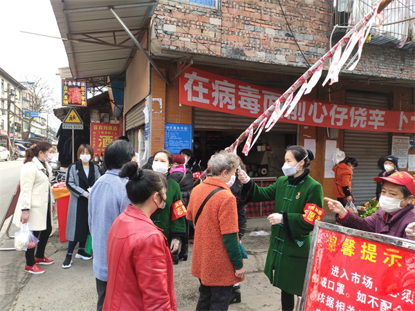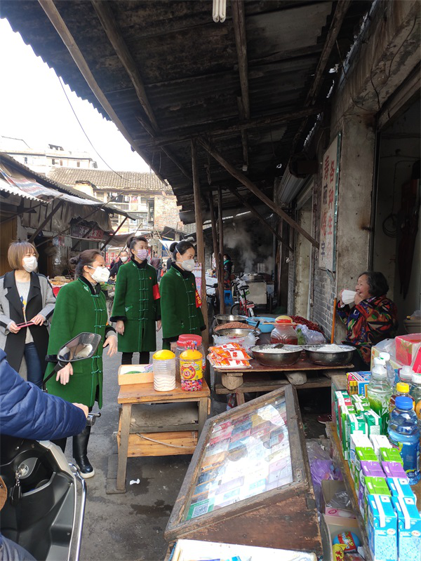 3月6日上午9點(diǎn),瀘州市南壽山實(shí)業(yè)發(fā)展有限責(zé)任公司13名女員工來(lái)到江陽(yáng)區(qū)藍(lán)田街道憲橋社區(qū)開(kāi)展疫情防控志愿服務(wù)活動(dòng)。此次活動(dòng)分為3個(gè)小組,1個(gè)小組負(fù)責(zé)在菜市場(chǎng)入口檢測(cè)體溫,并在菜市場(chǎng)內(nèi)部巡邏督促商戶及群眾佩戴口罩,做好防護(hù)措施;其余2個(gè)小組負(fù)責(zé)巡街勸導(dǎo)市民群眾不要集中打堆,外出自覺(jué)佩戴口罩。
